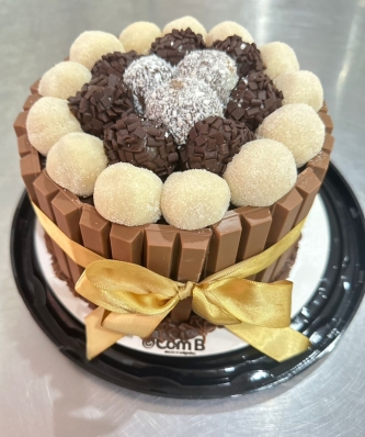 Bolo sabor brigadeiro cercado com kit kat, coberto com brigadeiros gourmet tamanho tradicional no sabores de: brigadeiro, prestígio e leite ninho. Caso queira alterar a cor da fita ou o sabor do recheio, finalize seu pedido pelo site e ligue para alterar o pedido pelo fone (48) 3372-5651.