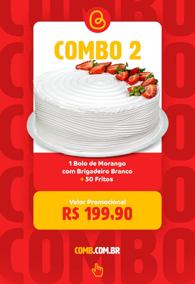 01 Bolo Morango (Pão de ló Branco, recheado com duas camada de brigadeiro branco com morangos picados. Cobertura de chantilly branco e finalizado com morangos).+ 50 salgadinhos (20 coxinhas, 15 risoles de queijo com presunto e 15 salsicha empanada).