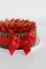 Bolo sabor brigadeiro cercado com kit kat, coberto com morangos. Caso queira alterar a cor da fita ou o sabor do recheio, finalize seu pedido pelo site e ligue para alterar o pedido pelo fone (48) 3372-5651.