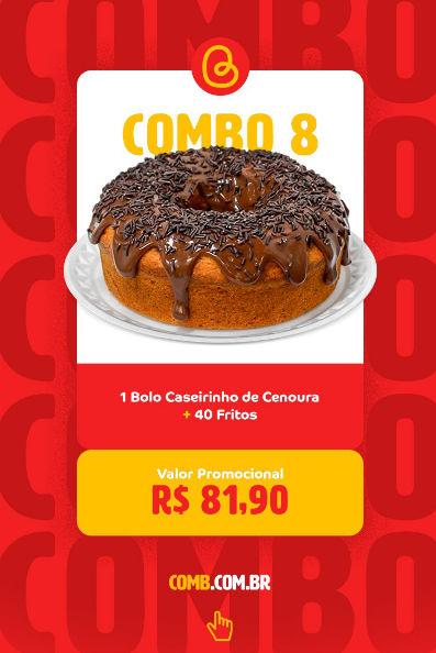 Especificações do produto: 01 bolo caseirinho com opção de escolha entre, sabor: - Cenoura, coberto com calda de brigadeiro; - Fubá, com açucar de cobfeiteiro polvilhado. Acompanha 40 salgadinhos (20 coxinhas, 10 risoles de queijo com presunto e 10 salsicha empanada). Rendimento: em média para 04 à 05 pessoas. |